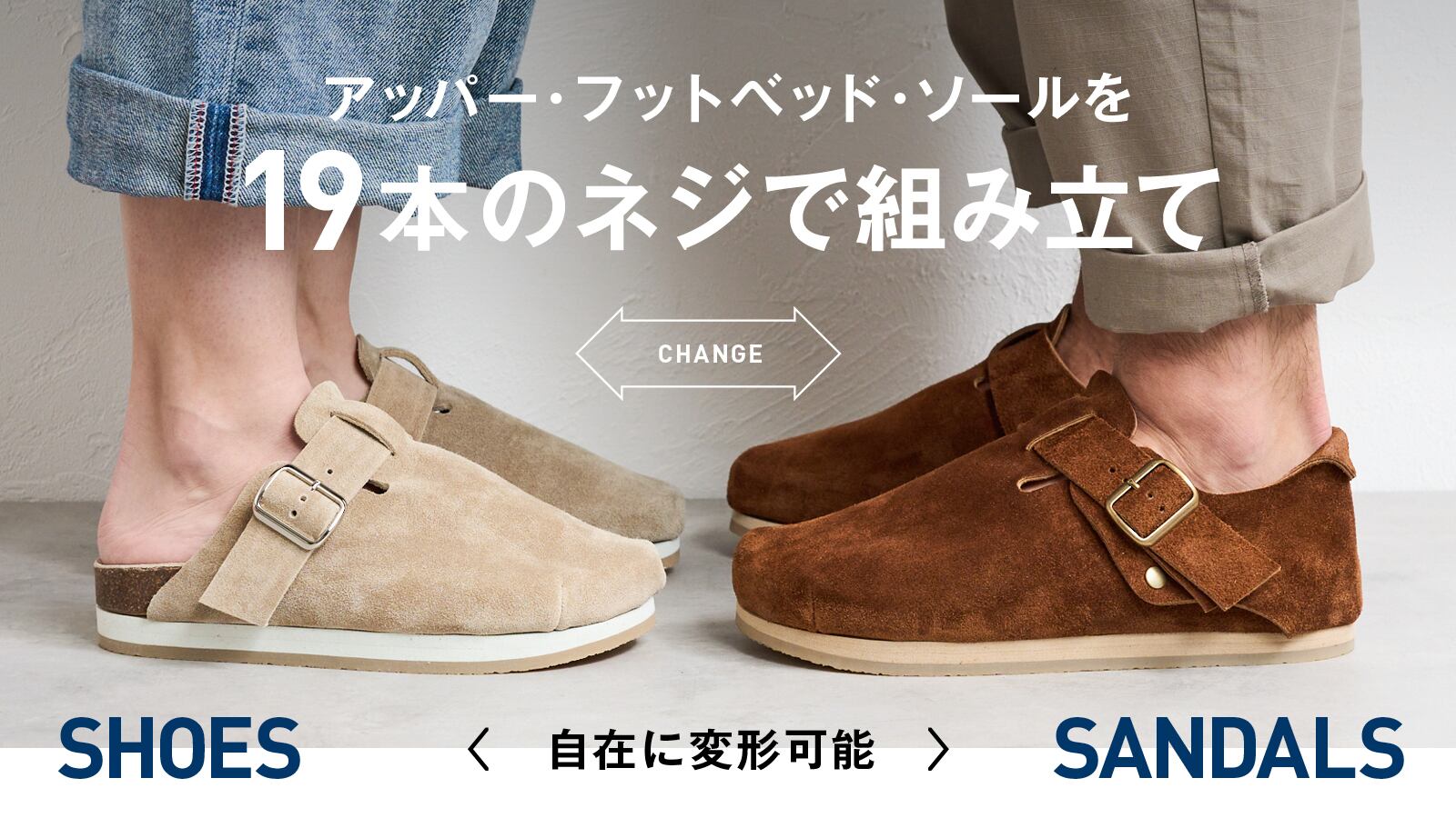 踵のネジ5本を外すことにより、踵のパーツを取り外すことができ、シューズからサンダルに変身させることができます。